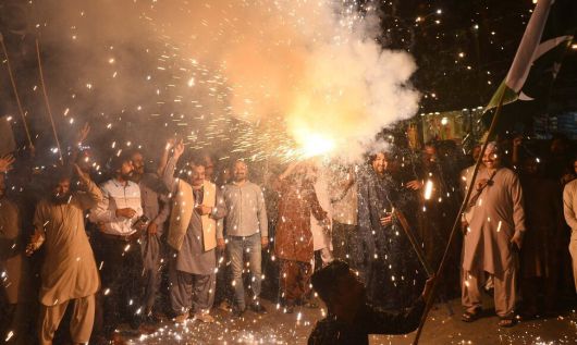 파키스탄 신드주 하이데라바드에서 사람들이 파키스탄과 인도 사이 휴전을 축하하고 있다. EPA 연합뉴스 |
