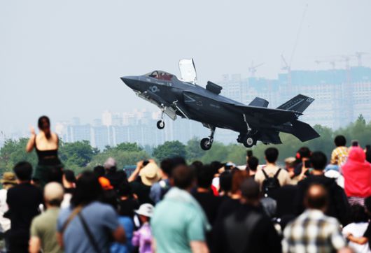 5월 11일 경기도 평택시 주한미공군 오산기지에서 열린 '오산 에어 파워 데이 2025'에서 미해병대 F-35B 전투기가 비행하고 있다. 연합뉴스 |