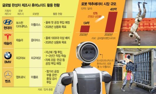 글로벌 완성차 업계는 잇따라 휴머노이드 로봇을 공정에 활용하고 있다. 테슬라는 옵티머스가 만든 휴머노이드를 생산 현장에 올해 1000대 이상 배치한다. BMW는 피규어02 로봇을 지난해 7월 공장에 투입해 작업 학습을 시키고 있다. 향후 휴머노이드가 조립·판금을 담당한다. 벤츠는 로봇 아폴로에 헝가리 공장의 부품 운반과 품질 검사 작업을 맡겼다.