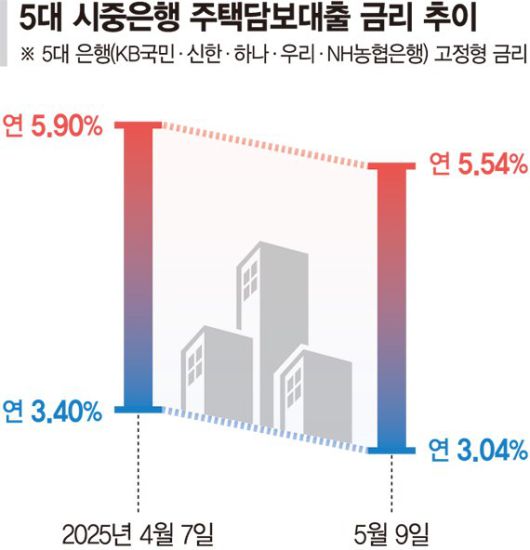 11일 금융권에 따르면 5대 은행(KB국민·신한·하나·우리·NH농협은행)의 고정형 주담대 금리는 연 3.04~5.54%(9일 기준)에 형성됐다. 한 달 전 연 3.40~5.90%였던 것과 비교하면 상·하단 모두 0.36%p 낮아졌다.