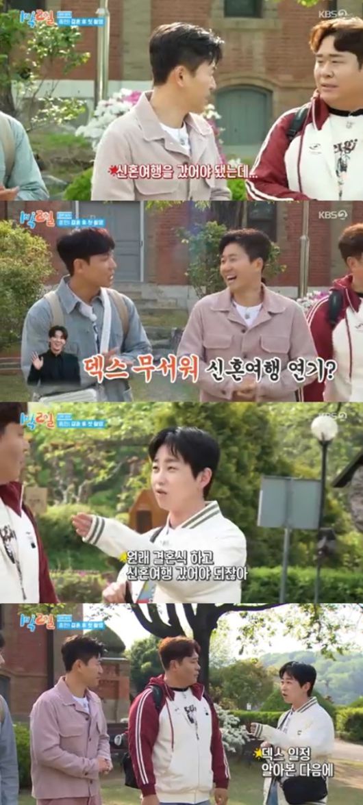 이날 김종민은 지난 4월 20일 결혼식을 한 뒤 첫 촬영에 원래는 신혼여행을 갔어야 했는데 안 갔다고 말했다.