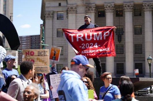 도널드 트럼프 미국 대통령의 한 지지자가 10일(현지시각) 미국 뉴욕에서 열린 ‘반트럼프 집회’에서 집회를 방해하는 모습. REUTERS 연합뉴스 |