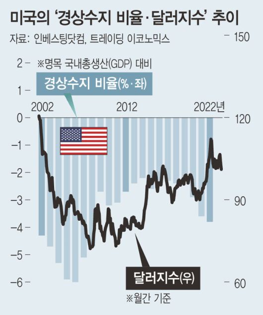 달러가치는 2000년대 들어서 금융위기(2008년) 이전까지 눈에 띄는 약세를 보였다. 공교롭게도 같은 시기 미국의 지디피 대비 경상수지 적자는 고공 행진을 계속했다. 왜 이런 현상이 나타난 걸까?