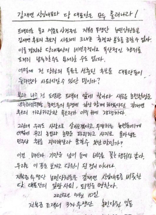 ▲전봉준트랙터 3차 투쟁단 농민단원들이 지난 5월 10일 공개한 성명서. ⓒ위두환씨 |
