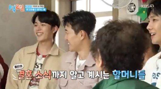 어르신들은 김종민에게 "결혼 축하한다", "신혼여행 못 갔지"라고 말하며 김종민의 결혼 관련 소식도 다 알고 있는 모습을 보였다.