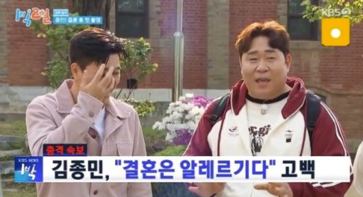 11일 방송된 KBS2 '1박 2일 시즌4'에서 김종민은 결혼 소감을 전했다. 경상북도 칠곡에서 진행된 이날 방송은 김종민의 결혼 후 첫 촬영.