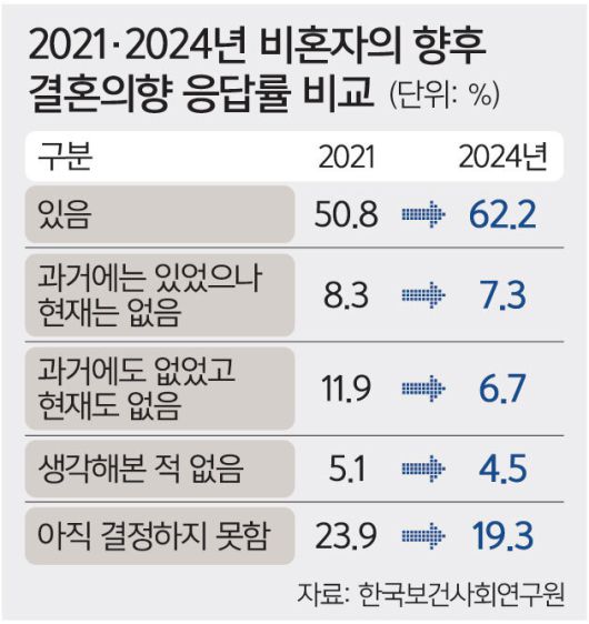 최근 3년간 결혼 의향이 있는 비혼자 비율은 11%포인트 이상 늘었다는 조사결과가 나왔다. 결혼은 출산으로 이어질 가능성이 큰 만큼 향후 저출생 해소에 긍정적 영향을 끼칠 수 있는 신호라는 해석이 나온다.