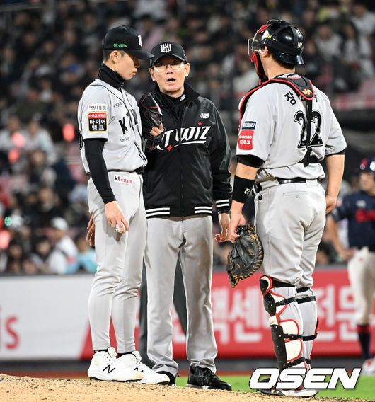[OSEN=수원, 이대선 기자] 11일 오후 수원 KT위즈파크에서 2025 신한 SOL Bank KBO리그 KT 위즈와 롯데 자이언츠의 더블헤더 2차전 경기가 열렸다. KT는 오원석, 롯데는 이민석을 선발 투수로 내세웠다. 7회초 1사 만루에서 마운드를 방문한 KT 이강철 감독이 원상현을 격려하고 있다. 2025.05.11 /sunday@osen.co.kr