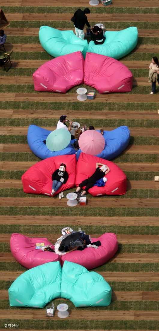 도서관을 방문하지 않고 야외에서 자유롭게 책을 읽을 수 있는 ‘서울야외도서관’이 마련된 서울광장에서 11일 시민들이 푹신한 빈백 의자에 누워서 책을 보고 있다.