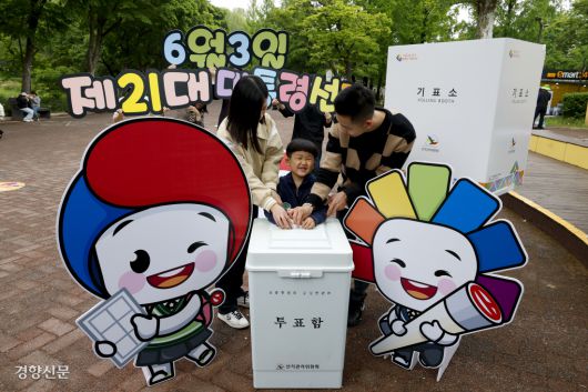 한 어린이가 11일 서울 광진구 서울어린이대공원에서 열린 21대 대통령 선거 투표 참여 홍보 캠페인에서 어른의 도움을 받아 투표 체험을 하고 있다.문재원 기자 mjw@kyunghyang.com▶ 매일 라이브 경향티비, 재밌고 효과빠른 시사 소화제!▶ 주 3일 10분 뉴스 완전 정복! 내 메일함에 점선면 구독©경향신문(www.khan.co.kr), 무단전재 및 재배포 금지