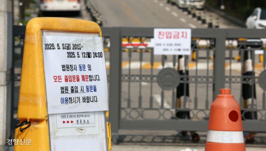 출입구 막힌 법원청사…오늘 세 번째 재판 윤석열, 포토라인에 설까 내란 우두머리 혐의 등으로 기소된 윤석열 전 대통령의 세 번째 재판을 하루 앞둔 11일 서울 서초구 서울중앙지법 출입구가 봉쇄되어 있다. 경호상 이유로 지하주차장을 통해 출입한 윤 전 대통령은 12일에는 기자들과 마주할 수 있는 서관 출입구로 출석할 예정이다. 권도현 기자 lightroad@kyunghyang.com |