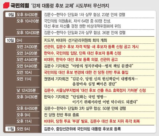 국민의힘 지도부가 본격적인 후보 교체 작업에 돌입한 건 지난 10일 0시 무렵이다. 김문수 국민의힘 대통령 후보와 한덕수 후보 양쪽의 실무진이 9일 오후 8시30분, 오후 10시30분 두차례 단일화 협상을 벌였음에도 별다른 성과가 없자, 지도부 주도로 ‘강제 단일화’ 절차에 착수한 것이다. 앞서 2차 실무협상이 열리기 전인 오후 10시10분, 국민의힘 의원총회에서는 참석자 64명(전체 의원 108명) 중 찬성 60명, 반대 2명, 기권 2명으로 대통령 후보 재선출 권한을 비상대책위원회에 넘긴 상태였다.