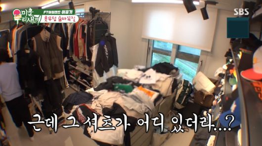 반신욕 후 이홍기는 드레스룸에서 셔츠를 찾기 시작했고, 엄청나게 쌓아있는 옷무덤을 본 서장훈은 질색했다.