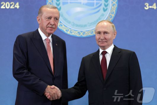 블라디미르 푸틴 러시아 대통령이 3일 (현지시간) 카자흐스탄 아스타나에서 열린 상하이 협력기구(SCO) 정상회의 중 레제프 타이이프 에르도안 튀르키예 대통령과 만나 악수를 하고 있다. 2024.07.04 ⓒ AFP=뉴스1 ⓒ News1 우동명 기자 |