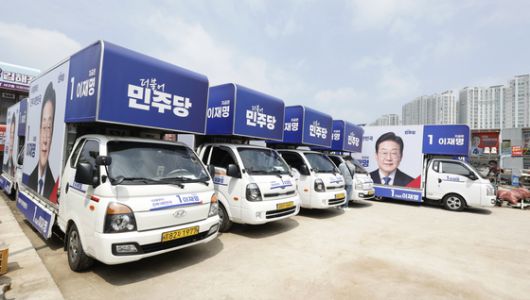 제21대 대통령선거 공식 선거운동을 하루 앞둔 11일 광주광역시의 한 차량광고업체에 완성된 더불어민주당 유세 차량이 세워져 있다. [뉴스1] |