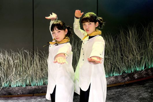 창작진과 배우들은 동물의 특징을 포착해 함께 만든 재치 있는 움직임으로 이야기에 설득력을 더했다. 날개에 힘을 주고 위협하듯 파르르 떠는 ‘시그니처 동작’을 보여주는 ‘펭귄’ 역 설가은(오른쪽)양과 최은영양. 무대 위 ‘펭귄’이 이 동작을 할 때마다 객석에선 웃음이 터진다. /라이브러리컴퍼니 |