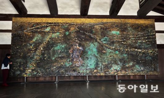 일본 교토 니조성에 설치된 안젤름 키퍼의 대작 회화 ‘옥타비오 파스를 위하여’. 키퍼가 이번 개인전을 위해 지난해 여름 완성한 작품이다. 폭 9m가 넘는 캔버스에 금박과 금속을 산화한 청록색 안료 및 돌과 숯 등을 사용해 들판을 그렸다. 그림 위엔 ‘각자는 서로이며 그 누구도 아니다: 텅 빈 이름 사이로 서로 스치고 사라질 뿐’이라는 파스의 시 ‘바람, 물, 돌’의 마지막 구절이 적혀 있다. 교토=김민 기자 kimmin@donga.com |