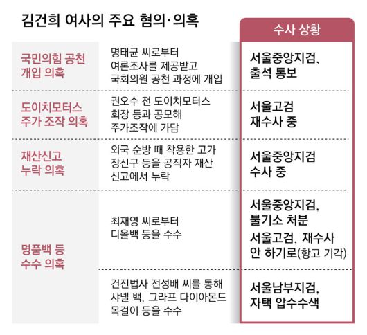 김 여사는 2022년 대선 당시 명 씨로부터 여론조사 결과를 제공받고, 그 대가로 김영선 전 국민의힘 의원의 공천에 개입했다는 혐의를 받고 있다. 같은 해 지방선거에서 경북 포항시장 후보 등 공천에 개입하고, 지난해 총선에서 김상민 전 검사가 공천되도록 영향력을 행사했다는 의혹도 받는다. 다만 김 전 검사의 공천은 이뤄지지 않았다.