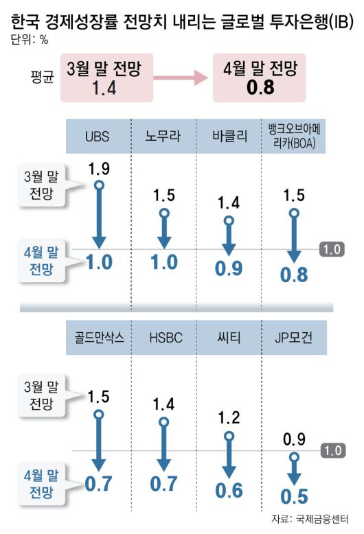 3월 말까지 1.9%와 1.5%의 성장률을 전망했던 UBS와 노무라는 1%로 낮췄다. 이 두 곳을 제외한 6개 투자은행은 올해 한국이 1% 미만의 경제 성장을 할 것으로 내다봤다. 골드만삭스는 기존 1.5% 전망의 절반에도 못 미치는 0.7%로 하향 조정했고, JP모건은 0.9%에서 0.5%로 낮춰 잡았다.