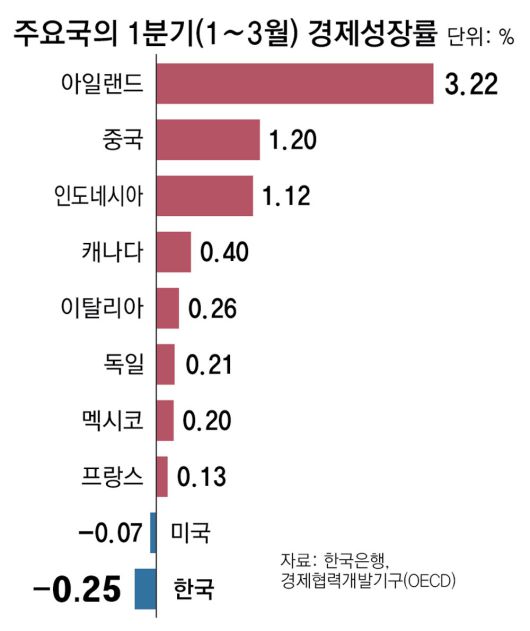 11일 한국은행과 경제협력개발기구(OECD) 등에 따르면 한국의 1분기(1∼3월) 국내총생산(GDP) 성장률(―0.25%)은 OECD 회원국과 중국 등 성장률을 발표한 주요국 19곳 가운데 가장 낮은 것으로 나타났다.