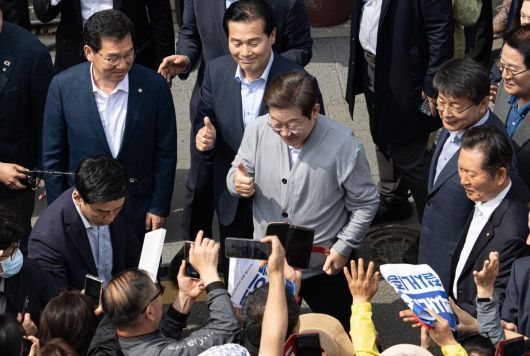 경청투어에 나선 이재명 더불어민주당 대통령 후보가 11일 오후 전남 영암군 독천낙지거리에서 시민들에게 인사하고 있다. 2025.5.11/뉴스1 |