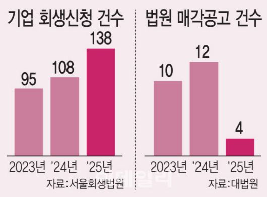 11일 서울회생법원에 따르면 올해 4월 말까지 법인회생 사건 접수는 138건으로 전년 동기 108건 대비 약 27.8% 늘었다. 2023년 같은 기간 접수 건수 95건과 비교하면 45% 이상 증가한 수치다.