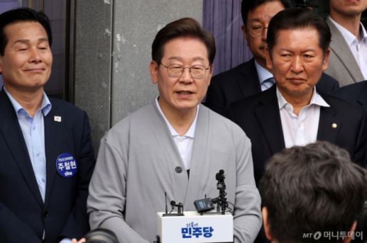 민심을 청취하는 '경청 투어'에 나선 이재명 더불어민주당 대선후보가 11일 전남 영암군 학산면 독천 낙지거리에서 주민들을 만난 뒤 백브리핑을 하고 있다. 2025.05.11. /사진=조성우 |