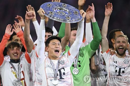 김민재는 지난 11일 독일 뮌헨의 알리안츠 아레나에서 열린 2024-2025 독일 분데스리가 시상식에서 우승 트로피인 '마이스터 샬레'를 높이 들었다.