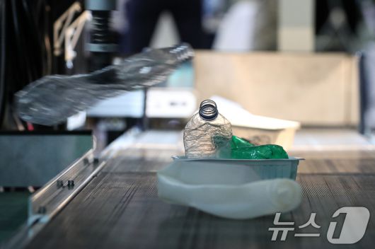 28일 경기 고양시 킨텍스에서 열린 폐기물자원순환산업전&친환경·미래소재 2024 차세대 분체산업전에서 폐기물 로봇 선별기가 폐기물을 분류하고 있다. 2024.8.28/뉴스1 ⓒ News1 이승배 기자 |