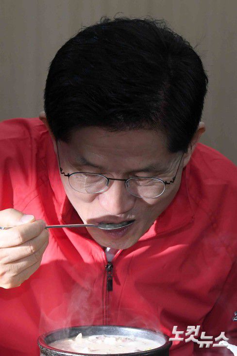 김문수 국민의힘 대선 후보가 제21대 대통령 선거 공식 선거운동이 시작된 12일 새벽 서울 송파구 양재대로 가락시장을 방문해 상인들과 순대국밥을 먹고 있다.저작권자 © CBS 노컷뉴스 무단전재 및 재배포 금지