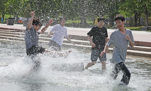 최고기온이 25도까지 오르며 무더운 날씨를 보인 지난 8일 오후 서울 여의도 한강공원을 찾은 학생들이 물놀이를 하고 있다. 뉴스1 |