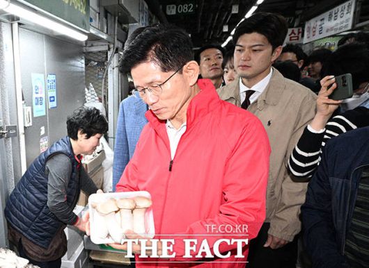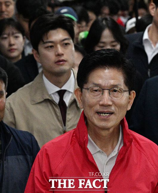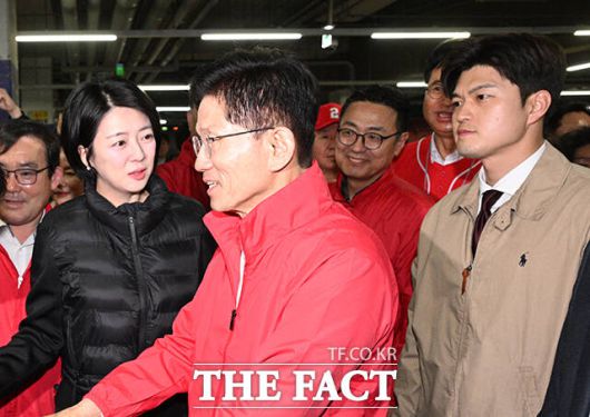 [더팩트ㅣ박헌우 기자] 국민의힘 대선후보 교체 문제로 사퇴한 권영세 비상대책위원장 후임으로 내정된 김용태 의원(왼쪽)이 12일 오전 서울 송파구 가락시장에서 김문수 국민의힘 대선 후보를 보좌하고 있다.