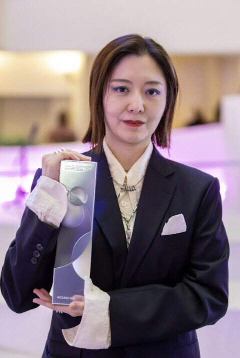 LG 구겐하임 어워드 수상자인 김아영 작가가 상패를 들고 기념촬영을 하고 있다. (사진=LG전자)