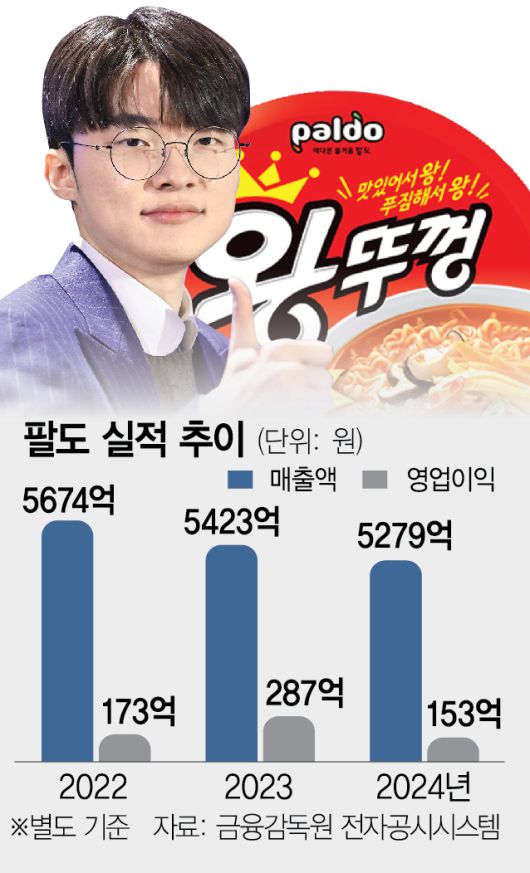 팔도는 지난해 팔도 비빔면과 틈새라면의 모델로 각각 배우 변우석과 보이그룹 제로베이스원을 선정하는 등 모델 발탁에 공을 들이고 있다. 지난해 매출액(개별 기준)이 5279억 원으로 2022년(5674억 원)과 2023년(5423억 원)에 이어 내리막길을 걷는 데다, 주력 제품인 팔도 비빔면은 배홍동(농심)과 진비빔면(오뚜기)의 위협을 받고 있기 때문이다.