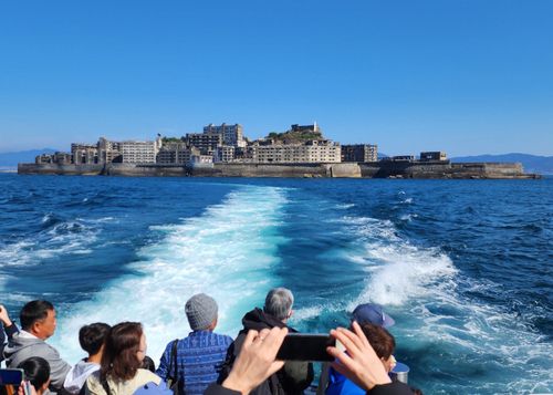 유람선에서 군함도를 바라보는 관광객들 |