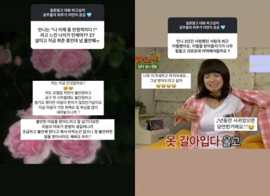 또 "2년간 사랑했던 사람과 최근 이별했다. 이별을 받아들이기가 너무 힘들고 괴로운데 어떡해야하냐"는 물음에는 "너무 이겨내려고 하지 마세요. 그냥 받아들이고 살자. 2년 동안 사귀었으면 당연한 것"이라고 위로했다.