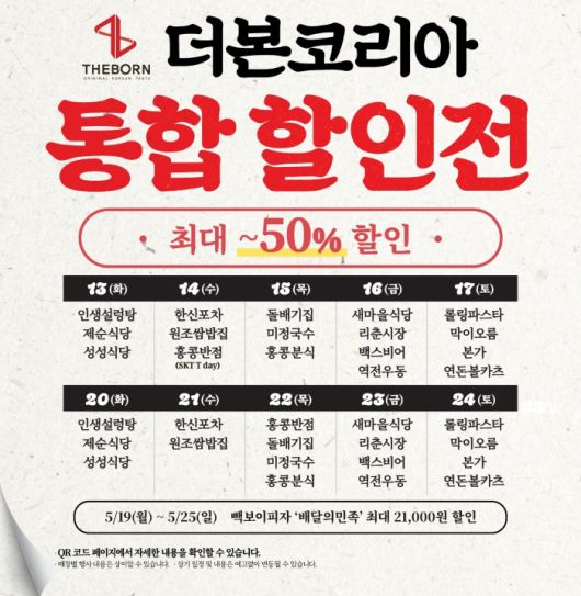 5월 13일부터 24일까지 2주간 진행되며, 요일별 지정된 브랜드의 매장 방문 식사 시 혜택을 받을 수 있다. 요일별 참여 브랜드는 5월 13일·20일(화) 인생설렁탕, 제순식당, 성성식당 5월 14일·21일(수) 한신포차, 원조쌈밥집 5월 15일·22일(목) 돌배기집, 홍콩분식, 미정국수 5월 16일·23일(금) 역전우동, 리춘시장, 새마을식당, 백스비어 5월 17일·24일(토) 연돈볼카츠, 롤링파스타, 본가, 막이오름 5월 22일(목) 홍콩반점 등이다.