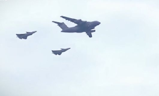 [서울=뉴시스] ??중국이 군수송기를 동원해 파키스탄에 구호물자를 수송했다는 소문이 제기되자 중국군이 가짜 뉴스라며 해명에 나섰다. 사진은 윈(Y)-20 옆에 최신예 스텔스 전투기 젠(J)-20 2대가 호위비행을 하는 모습. 2025.05.12 |