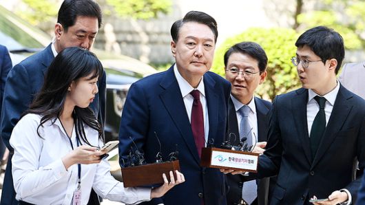 윤 전 대통령은 말 없이 포토라인을 지나쳐 변호인·경호원과 함께 법원 입구로 들어섰다. 기자들이 ‘비상계엄 선포에 대한 사과할 생각이 있나’ ‘군부정권 이후 계엄 선포한 헌정사상 첫 대통령이었는데 아직 스스로 자유민주주의자라 생각하느냐’ ‘대선을 치르게 됐는데 전국민에게 할 말씀이 없나’ 등 몇 가지 질문을 던졌지만 대답하지 않았다.