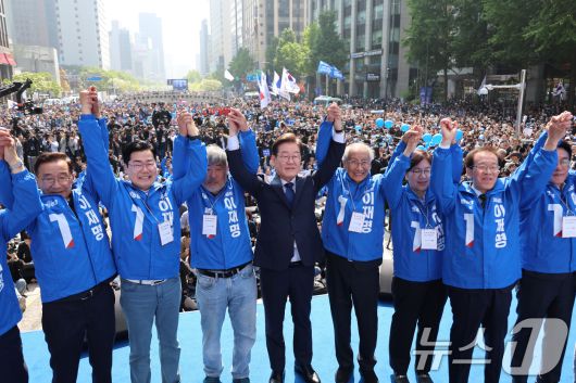 (서울=뉴스1) 김경민 임세원 한병찬 기자 = 더불어민주당이 12일 이재명 대통령 후보의 대선 출정식을 서울 광화문 청계광장에서 열었다. 민주당은 이번 대선은 헌정 수호 세력과 헌정 파괴 집단의 대결이라며 내란 종식을 외쳤다.