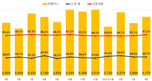 12일 경·공매 데이터 전문기업 '지지옥션'에 따르면 지난달 전국 아파트 경매 진행건수는 총 3175건으로 전월(2888건) 대비 약 10% 증가했다. 낙찰률은 40.1%로 전월(39.9%)과 비슷한 수준을 유지했으며, 낙찰가율은 87.3%로 2.2%포인트(p) 상승했다. 평균 응찰자 수는 전월(8.3명) 대비 0.5명 늘어난 8.8명으로 매월 증가세를 보이고 있다.