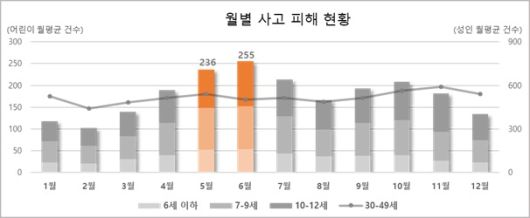 [헤럴드경제=박성준 기자] 어린이 교통사고 피해가 어린이날이 포함된 5~6월에 집중되는 것으로 나타났다. 가정의 달을 맞아 외부 활동이 늘어나는 것이 주요 원인으로 분석된다. 특히 주된 야외 활동 시간인 오후 하원·하교 시간이나 놀이 시간에 사고가 집중됐다.