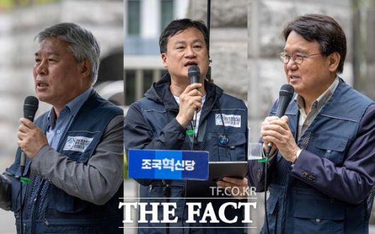 조국혁신당이 10일 '검찰청 도장 깨기' 프로젝트의 일환으로 대전지방검찰청 앞에서 '검찰 해체'를 촉구하는 기자회견을 열었다. 왼쪽부터 서왕진 신임 원내대표, 황명필 최고위원, 황운하 대전시당위원장. /조국혁신당 대전시당 |