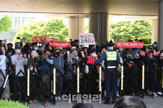 [사진공동취재단] 윤석열 전 대통령이 12일 오전 서울 서초구 중앙지방법원에서 열린 내란 우두머리 혐의, 직권남용 권리행사방해 혐의 사건 3차 공판에 출석한 가운데 지지자들이 윤석열을 연호하고있다 . 2025.05.12.
