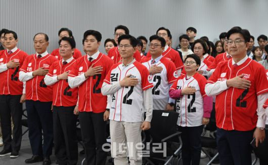 [이데일리 이영훈 기자]김문수 국민의힘 대선 후보를 비롯한 국민의힘 의원들이 12일 오전 서울 영등포구 여의도 국민의힘 중앙당사에서 열린 중앙선대위 임명장 수여식에서 국민의례를 하고 있다.