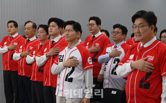 [이데일리 이영훈 기자]김문수 국민의힘 대선 후보를 비롯한 국민의힘 의원들이 12일 오전 서울 영등포구 여의도 국민의힘 중앙당사에서 열린 중앙선대위 임명장 수여식에서 국민의례를 하고 있다.