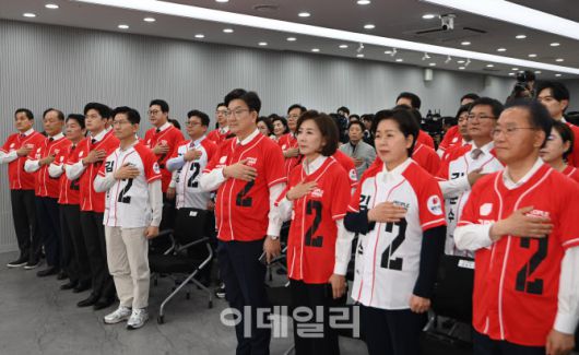 [이데일리 이영훈 기자] 김문수 국민의힘 대선 후보를 비롯한 국민의힘 의원들이 12일 오전 서울 영등포구 여의도 국민의힘 중앙당사에서 열린 중앙선대위 임명장 수여식에서 국민의례를 하고 있다.