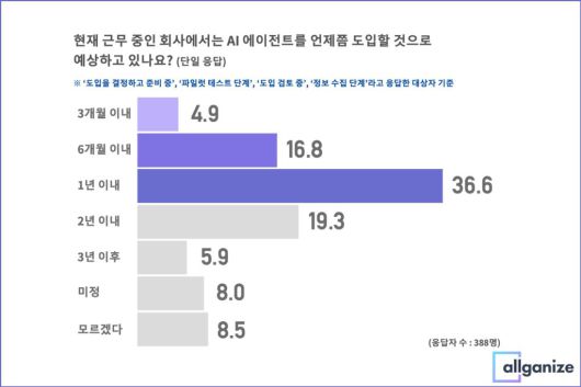 AI 에이전트 도입을 계획 중인 응답자 388명을 대상으로 '현재 근무 중인 회사에서 AI 에이전트를 언제쯤 도입할 것으로 예상하고 있나요?'라고 질문한 결과, 응답자의 58.3%가 1년 이내에 자사에 AI 에이전트가 도입될 것으로 예상했다.
