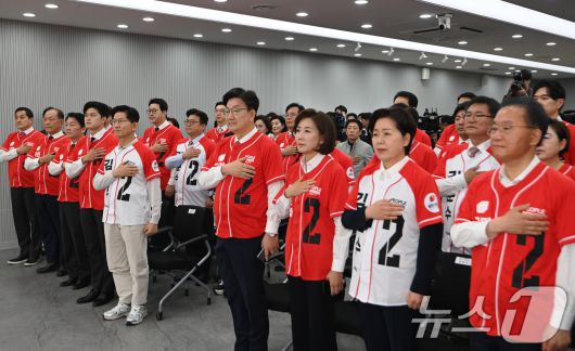 (서울=뉴스1) 이광호 기자 = 김문수 국민의힘 대통령 후보와 권성동 원내대표를 비롯한 공동선대위원장들이 12일 오전 서울 여의도 중앙당사에서 열린 중앙선대위 회의 및 임명장 수여식에 참석해 국민의례를 하고 있다.(공동취재) 2025.5.12/뉴스1skitsch@news1.krCopyright ⓒ 뉴스1. All rights reserved. 무단 전재 및 재배포, AI학습 이용 금지.