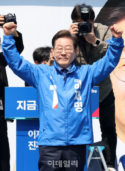 [이데일리 방인권 기자] 이재명 더불어민주당 대선 후보가 6·3 대통령선거 공식 선거운동 첫날인 12일 서울 광화문 청계광장에서 열린 출정식 및 첫 유세에서 포즈를 취하고 있다.